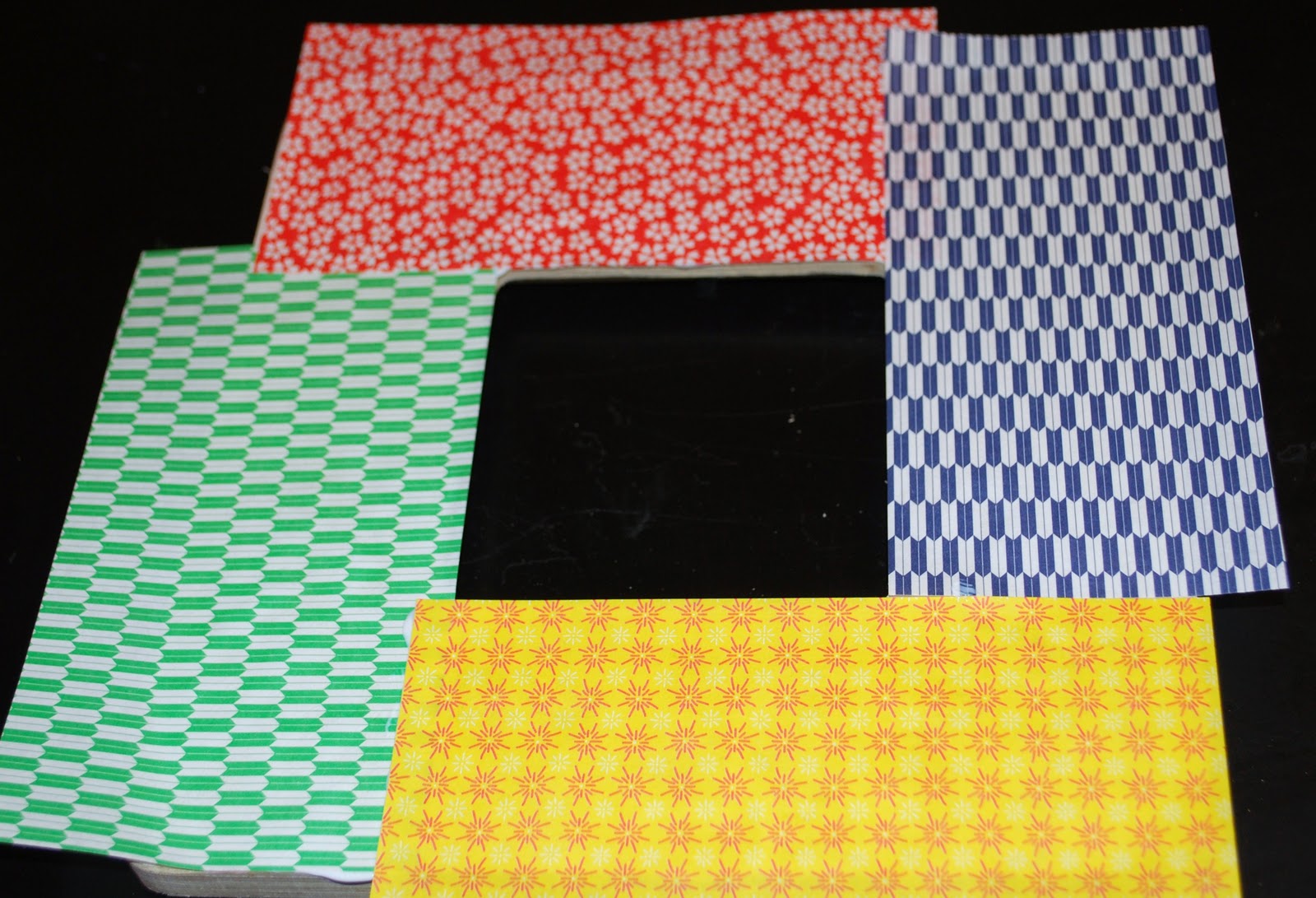 2. Put origami paper rectangles on the photo frame and allign. Tuck extra paper to the back of the frame and secure with scotch tape.